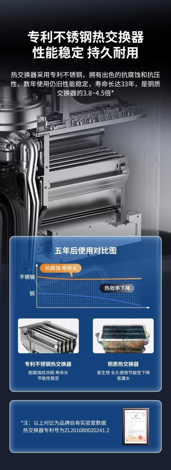 庆东纳碧安NCB300 在耐用性上也表现出色。它采用了不锈钢一体式专利热交换器(发明专利号:ZL201911407463.9),这种材质具有优异的抗腐蚀性能,能够有效延长壁挂炉的使用寿命。相比一些使用普通材质热交换器的壁挂炉,庆东纳碧安NCB300 可以在多年的使用过程中保持稳定的性能,降低了长期使用成本。