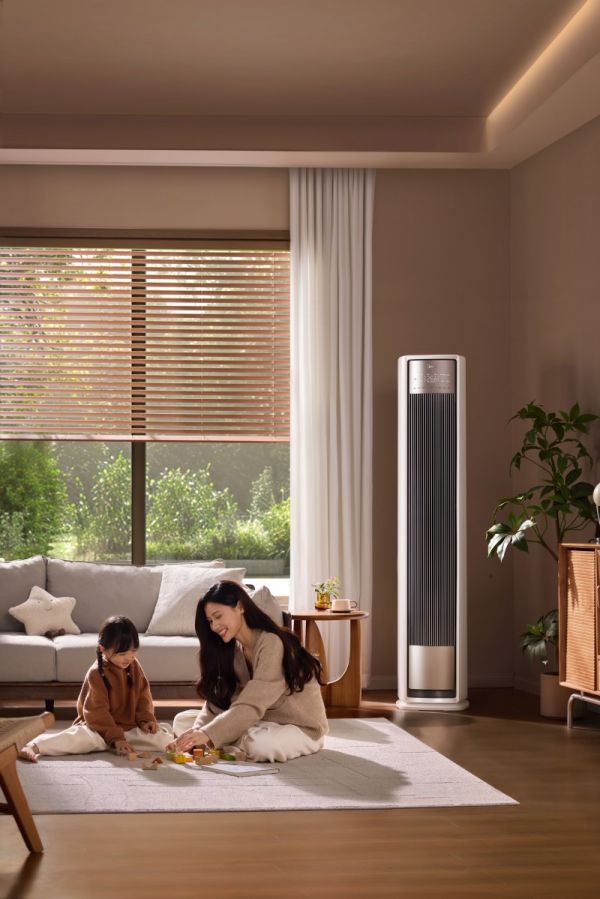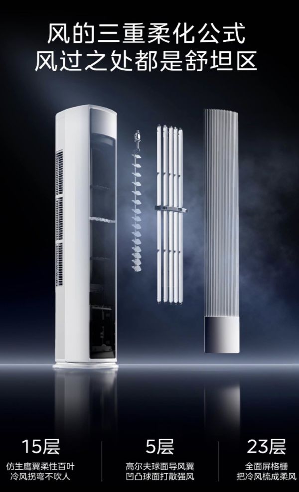 其创新的悬浮全面屏设计,突破了传统空调小风口和闭合导风板的局限,打造出270mm超宽幅出风口,是普通空调风口的两倍以上,可实现1750m³/h瞬时全面风,让全屋迅速享受澎湃清凉。在此基础上,更通过创新的23层全面屏格栅、5层高尔夫球面导风翼、15层仿生鹰翼柔性百叶三重导风结构,有效分散柔化气流,让出风更均匀、柔和,让用户感受到如置身自然般处处有风、处处舒适。这种创新的导风结构设计,克服了传统空调风口小出风范围小、动态扫风不均匀、有死角的问题,可同时满足澎湃性能、均匀风温和舒适体感三重感受,带来温感宜人、微风拂面的舒适体感。再加上其均匀智控温模式,可根据人体舒适度模型自适应调节风温,宝妈们再也不用担心忘记调温引起老人、小孩着凉。