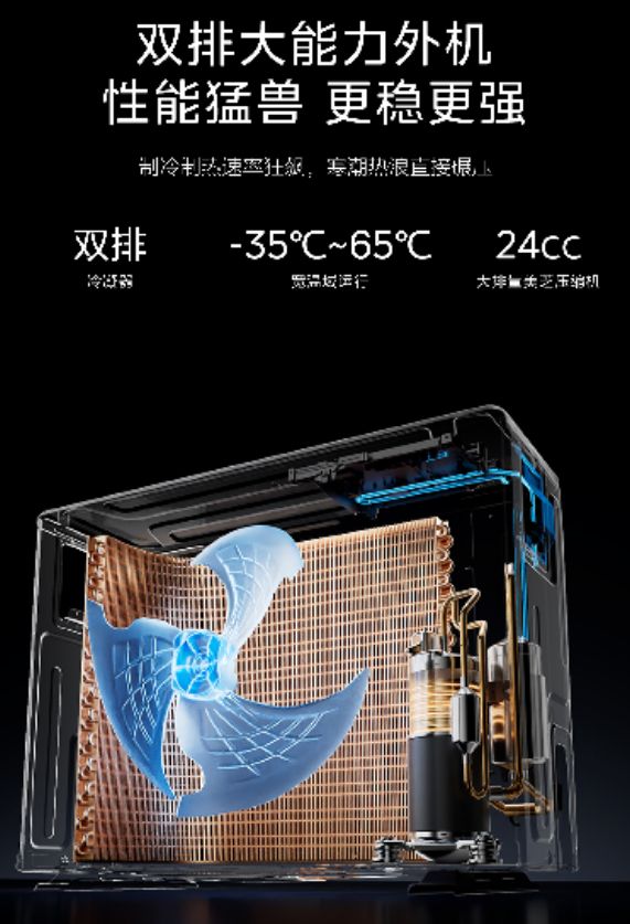 在性能方面,美的全面风空调应用了当前配置最硬核的超旋风内机搭配大能力外机,搭载24cc大排量美芝压缩机、电子膨胀阀、大双排冷凝器,可以实现4秒速启,制冷速度快3倍。更硬核的是其外机搭载了全效液冷散热系统专利技术,遥遥i领先于当下行业普遍采用的风冷散热技术方案,可实现在65℃高温和-35℃低温的极限条件下稳定制冷制热,彻底攻克了传统空调在极端天气下的性能瓶颈。