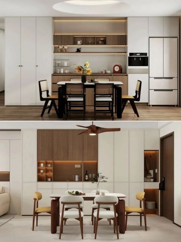 经典纯色+木色搭配,浅色作为大面积柜门,木色作为点缀或柜体,营造立体视觉效果。根据家居风格灵活调整配色,与墙面、地板颜色相协调,确保整体和谐统一。