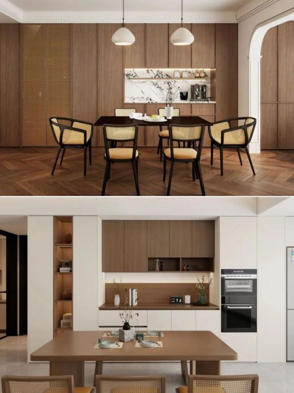 选用藤编门或有骨骼线的柜门设计,让空间更有立体感与层次感,同时增加复古气息。