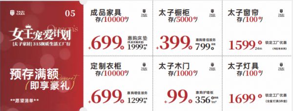 预存满额享超值折扣:预存达一定金额,畅享折上折。如预存金额满10000元可加699元惠购价值1999元乳胶优眠床垫限1张;预存金额满5000元加399元可惠购价值799元橱柜增值服务;6S样板间整装合同满3万元可任意惠购6项。从整家定制到成品家具,从硬装到软装,丰富的品类,贴心的福利,畅享太子家居给你宠爱!