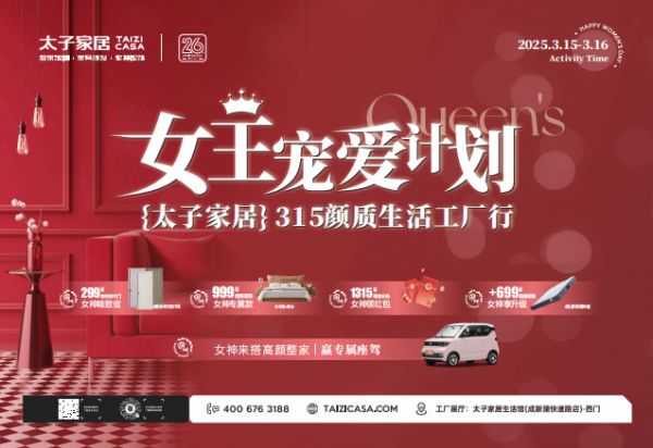 太子家居特别推出“女王宠爱计划·315颜质生活工厂行”活动,携超值优惠,助力您轻松实现整家焕新。