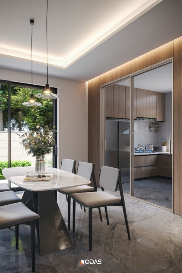 “再华丽的房子,若缺了烟火气,便少了生活的灵魂。”餐厨区以石纹台面与木质橱柜碰撞出温润质感,揽域140全景悬浮推拉窗以食品级金刚网隔绝蚊虫,却将林间绿意与天光毫无保留地引入。极窄边框与悬浮结构让窗框近乎隐形,半掩的梦幻帘滤去刺目阳光,留下斑驳光影在餐台上起舞。