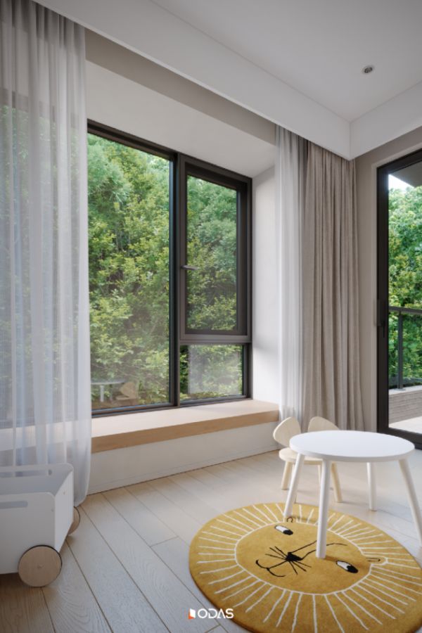 儿童房则暗藏巧思——悦风110外开窗配备儿童安全锁与限位器,不等腔玻璃隔绝99%紫外线,窗台圆角防撞设计,每一处细节皆是对成长的温柔守护。