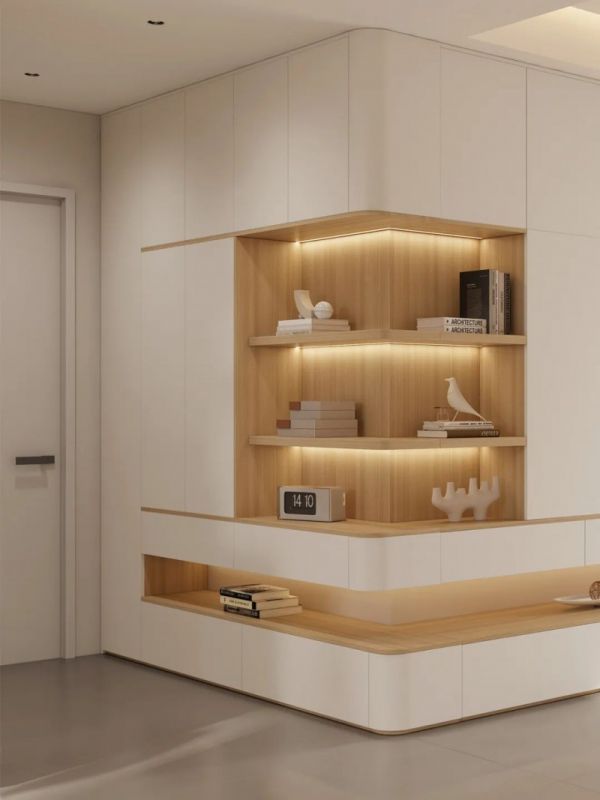 ①L型电视柜储物力超强,进门处与客厅用弧形转角流畅过渡,自然柔和。安全防磕碰。藏八露二合理划分,满足收纳需求,也兼具展示功能。