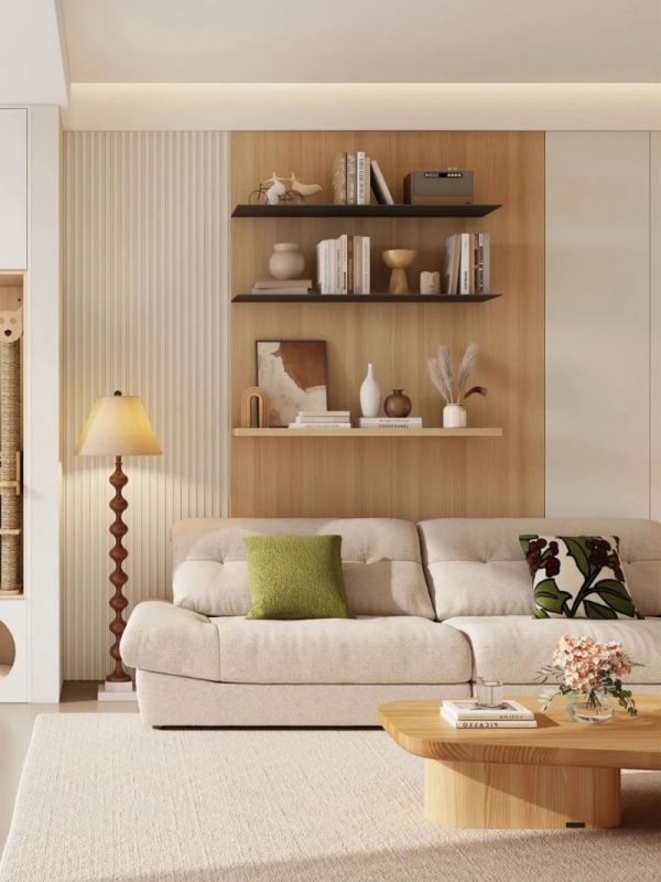 ②沙发背景墙用木饰面装饰,温馨耐看,搁板补充收纳,也丰富了空间的层次感。