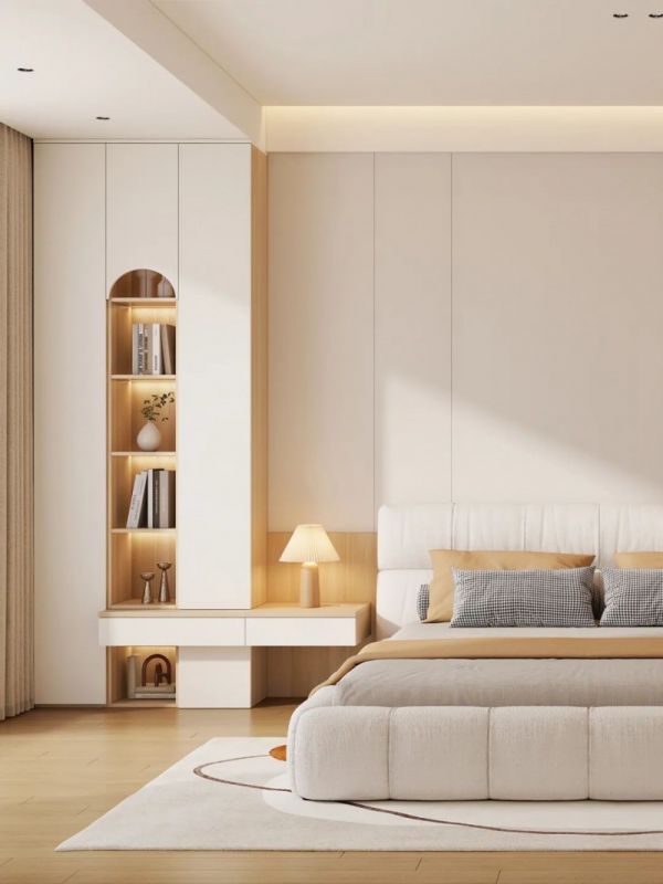 ①床头定制储物柜,巧妙穿插延展出台面,代替传统床头柜,既节约空间又美观。