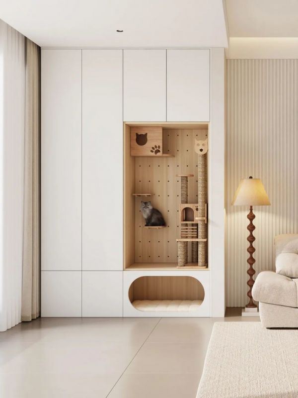 阳台与客厅打通,定制到顶式储物柜,内部留空定制猫爬架、猫窝,为家中的猫主子打造专属小天地。