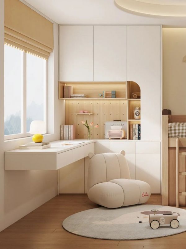 ②充分利用自然光线,靠窗定制书桌+书柜,满足孩子学习、阅读需求。