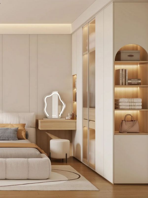 ②衣柜顶天立地,侧边留空可放置第二天的衣物,内侧留空延展台面充当梳妆台。日常梳妆更方便。