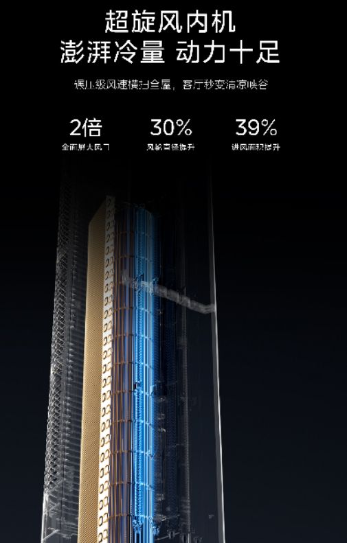 产品室内机的电机、风轮、风道、蒸发器等核心部件全面升级。采用2倍大的全面出风口及超宽弧面进风口,进风面积提升39%,风轮直径加大16.6%,同时采用了创新的低风阻“L”型蒸发器,实现了风量更大、循环更快、换热效率更高。