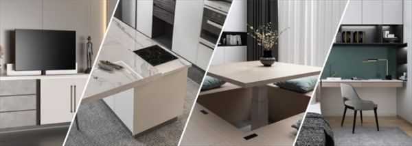 03定制化生态的构建逻辑在深度定制领域,捷昌建立了模块化系统,从客厅到餐厅再到到卧室均可为客户提供全方位的智能家居解决方案,如卧室智能化方案:智能梳妆镜和梳妆台驱动系统;厨房的吊柜系统、橱柜升降系统;客厅的电视机升降系统等智能方案。