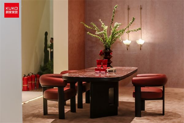 除此之外,此次顾家重磅展出的收藏品级「奢石系列PT3282餐桌」是客餐厅的另一大亮点产品,彰显出高端家庭的仪式感社交场。紫罗红石材源自天然,色泽瑰丽,纹理细腻,象征繁荣与昌盛;厚重木纹面托板稳固承托并保护桌面,圆润边角设计搭配设计感底座,释放独一wu二的奢美质感。