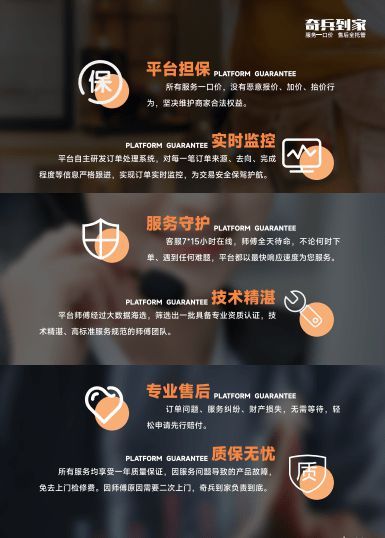 除了价格透明和服务高效,奇兵到家还为商家提供了完善的售后保障机制。平台承诺所有服务均享有一年质保,因师傅原因导致的二次上门服务,奇兵到家负责到底。此外,平台还推出了“先行赔付”机制,当服务过程中出现产品故障或其他损失时,奇兵到家将先行承担赔付责任。这一机制不仅提升了消费者的满意度,也让商家在售后服务上更加省心。