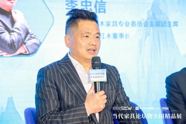 在“2025当代中国家具发展论坛”第二轮“非遗红木 大国精品”主题讨论中,李忠信红木董事长李忠信分享了企业在管理、品质、产品、诚信模式等方面的创新经验。