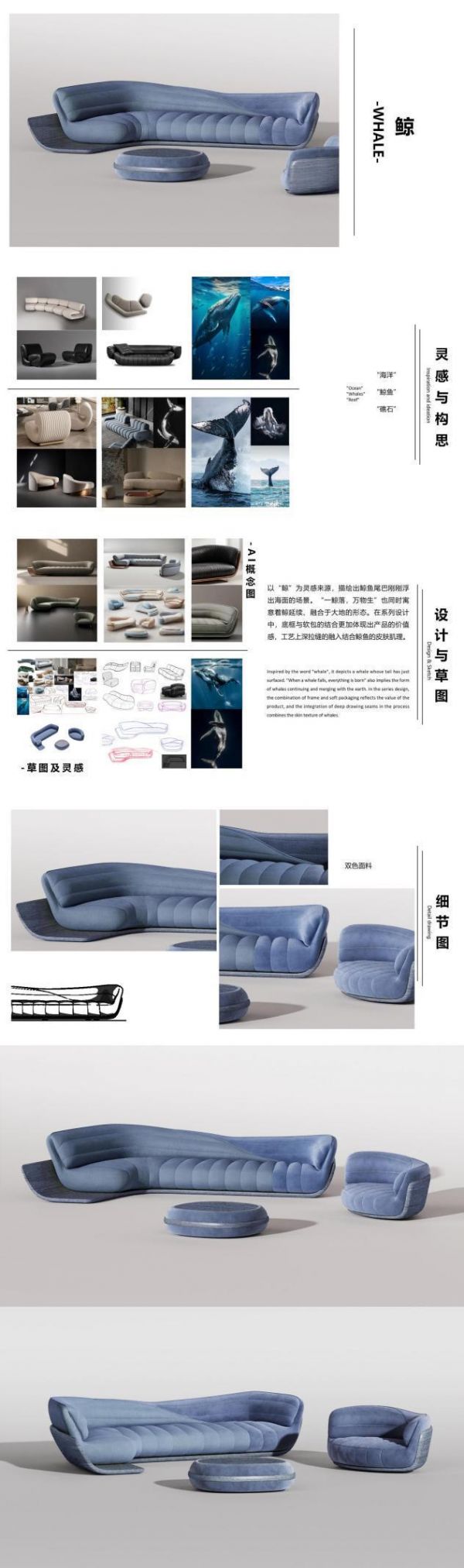 一款以鲸鱼为灵感来源的产品设计,描绘出鲸鱼尾巴刚刚浮出海面的场景。产品采用了底框与软包相结合的设计,双层设计增加了产品的层次感,软包部分则显得柔软且富有弹性,给人一种舒适的感觉。双色的面料拼接模拟了鲸鱼皮肤的质感。设计中融入了“一鲸落,万物生”的寓意,象征着鲸鱼的生命延续和与大地的融合。整体设计不仅美观,还充满了自然的气息,让人感受到大自然的力量和生命的循环。