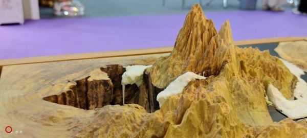 工艺处理上,运用精湛的雕刻与拼接分块,将木材上半部分雕琢成起伏山峦形态,塑造出立体、逼真的自然山脉,结合铲平的部分落杯品茶,模拟在蜿蜒山川攀岩,使其兼具自然美景与实用性。