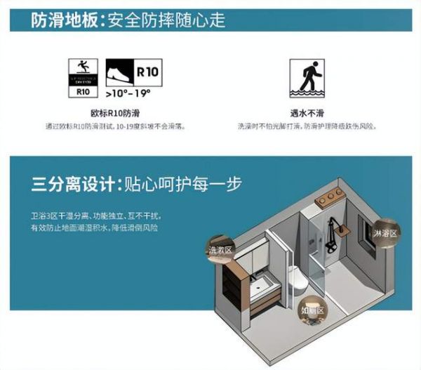 三区分离+防滑地板:洗漱、淋浴、如厕区域分离设计,减少地面积水;欧洲R10级强效防滑地板彻底解决湿滑隐患,让每一步更稳健;