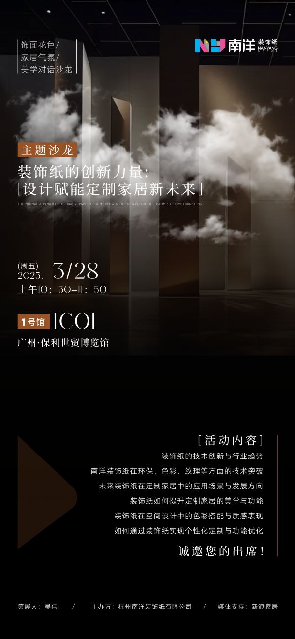展会期间,南洋装饰纸还将推出包括设计探展直播、“装饰纸的创新力量”对话沙龙系列活动,揭秘“云中厨房”设计细节,探讨行业趋势与技术突破!更有中居文化、新浪家居全程专题报道,覆盖百万级受众。
