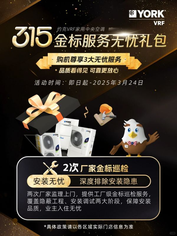 除了卓越产品性能之外,一流售后服务同样是用户选择的重要考量因素之一。约克VRF中央空调通过“315金标服务”构建起完善可靠售后支持网络。从产品咨询到安装调试,再到后期维护保养,全程都有专业团队给予指导帮助,确保每个环节都做到精益求精。