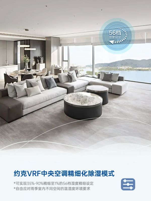 除了卓越的产品性能之外,约克VRF中央空调还致力于为用户提供全场景智能的家居温湿度解决方案。其搭载的温湿自控防潮系统,具有自动、精细、低温除湿功能,能够根据不同季节和环境变化进行智能调整。在春夏交替时期常见的回南天或梅雨季,约克VRF中央空调能够迅速响应并有效控制室内湿度,确保整个居住空间始终保持干爽宜人状态。这种智能化的人性化设计,大大提高了我们的生活品质,让我们在严寒冬季和炎热夏日都能享受到最贴合需求且舒适自在的环境氛围。