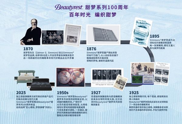 从1870年席梦思先生(Mr. Zalmon G. Simmons)正式创立 Simmons®席梦思公司,到1925年创始人席梦思先生(Mr. Zalmon G. Simmons)的儿子席梦思二世(Zalmon Simmons Il)以突破性设计理念首次研发推出 Beautyrest®(甜梦)系列床垫,再到Beautyrest®甜梦系列100周年纪念款的上市,每一个里程碑都是对品牌匠心精神的致敬。Simmons®席梦思始终以创新睡眠科技与卓越技艺,为每一位用户缔造专属的奢享美眠体验,守护他们的“甜梦之旅”,让甜梦传「绮」,生生不息。