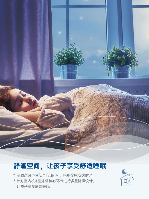 室内机同样注重降噪设计,采用多层吸音棉与精密榫卯框体,结合新型降噪分流器与仿生蜗壳蜗舌等消音技术,整体优化了风场噪音,运行音低至17dB(A),如同春日里轻柔的风声,让您在享受空调带来的舒适温度的同时,也能沉浸于那份难得的宁静与温馨之中。此外,“约克智慧家”APP还贴心地提供了夜间静音模式,只需轻轻一点,即可享受静谧如斯的夜间环境,让您在春夜中尽享静谧,仿佛整个世界都为您放缓了脚步。