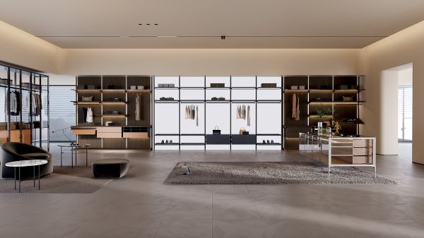 壁挂衣帽间系统以深棕色古木为主色调,仿佛将神秘森林的静谧带入家中。流畅的线条与极简设计将实用与美学完美结合。