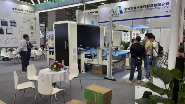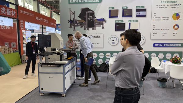 上午9时展会开幕后,海研展位(C区S16.4D10)即迎来密集客流。展台核心区域陈列的板材外观视觉检测设备,实时演示对家具板材表面缺陷的精准识别。