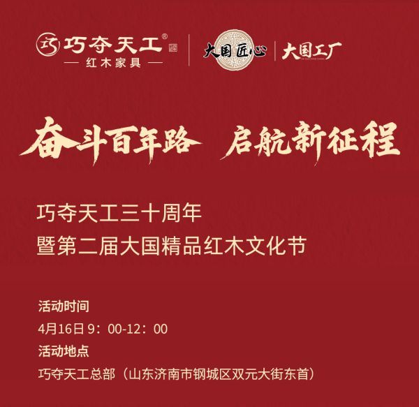 三十而立,百年可期。2025年,巧夺天工红木将迎来创立三十周年的重要时刻。值此之际,品牌将于4月16日在总部园区盛大举办30周年庆典暨第二届大国精品红木文化节。