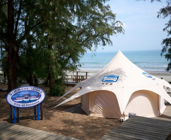 以碧海蓝天为巨幕,葱郁树林作帷幔,海浪有节奏地拍打着沙滩,与林间微风轻柔拂动枝叶的沙沙声,协奏出一曲舒缓而空灵的背景音乐。Simmons®席梦思主题帐篷 ——“甜梦小屋”静静伫立其间,将品牌“无论身处何处,都有甜梦相伴” 的美好愿景展现地淋漓尽致。