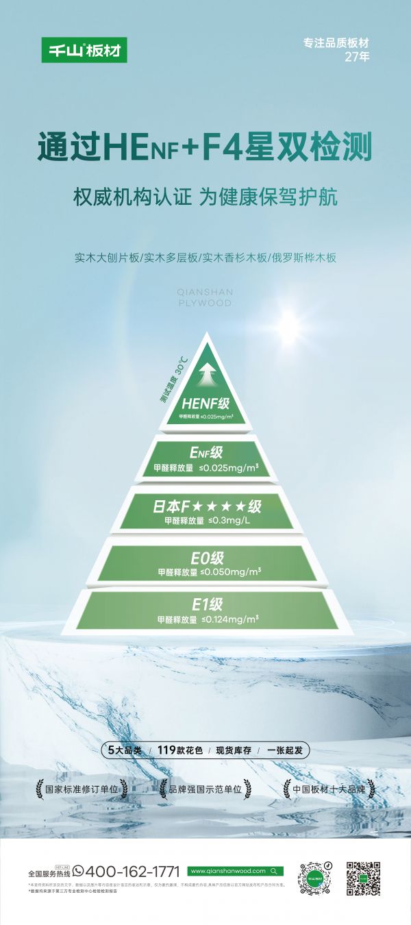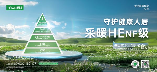 HENF级板材以极低的甲醛释放量和严格的测试条件,成为目前国内外最严格的环保等级之一,适合用于各种高温和采暖环境,为消费者提供了更健康、更安全的家居选择。千山板材不仅以技术硬实力抢占环保制高点,更以用户需求为中心,重新定义了健康家居的高标准。