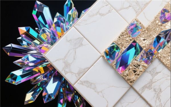 采用行业先驱"悬浮七彩晶体技术",多层淋釉干粒复合结构(底坯+面釉+炫彩干粒+纹理层+结晶干粒),晶耀效果较传统结晶釉提升50%,多角度折射流光溢彩。