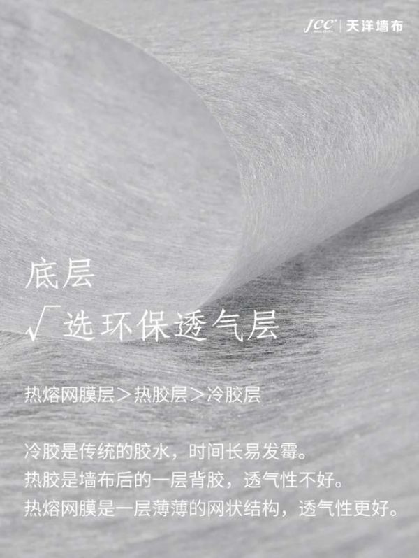 ✅热熔网膜墙布:热熔网膜是新型墙布粘接材料,同样是熨贴上墙,但区别于普通热胶,它是一层网状结构,一般用于高档汽车、西服内衬的粘接,透气性更好,更加环保。