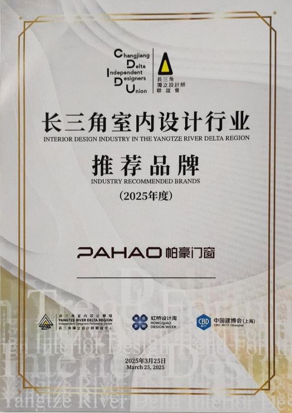 3月25日,帕豪门窗在「2025中国建博会(上海)暨首届虹桥设计周」论坛上,凭借其卓越的设计创新能力、微米级的制造工艺与卓越的产品品质,荣获“长三角室内设计行业推荐品牌”殊荣。这一奖项不仅是对帕豪门窗在室内设计和门窗制造领域的高度认可,也是对其在长三角地区日益扩大的影响力和美誉度的有力证明。