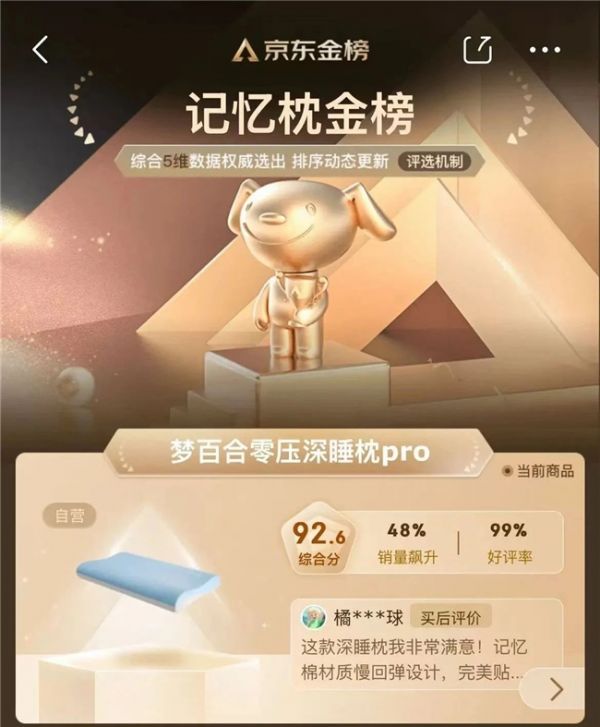 在销量快速提升的同时,梦百合0压深睡枕Pro凭借着创新的产品设计和优质的用户体验,获得了广大用户的高度认可。京东记忆枕金榜显示,梦百合0压深睡枕Pro好评率达99%。