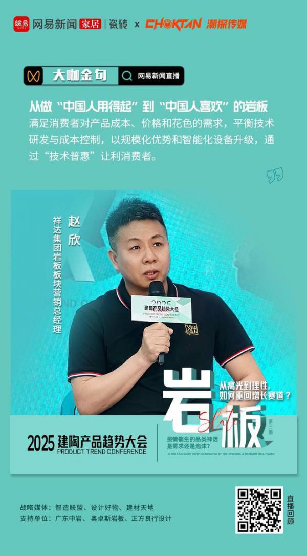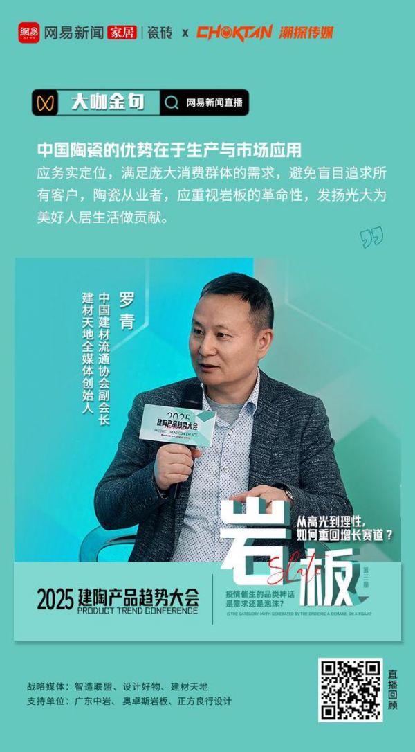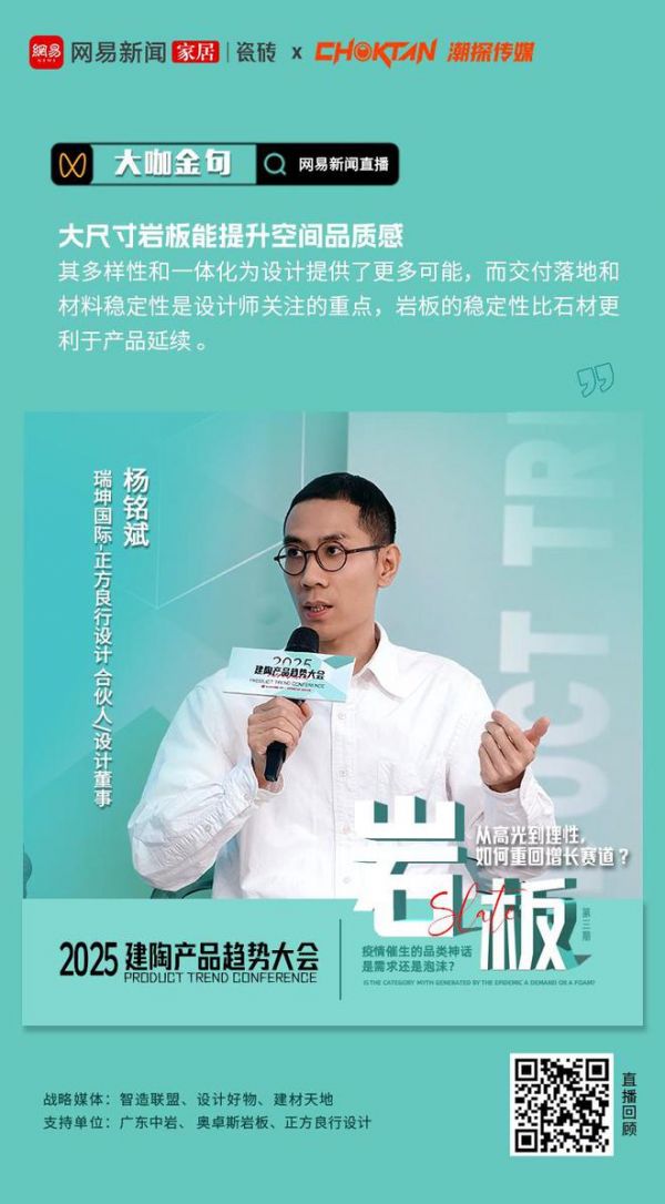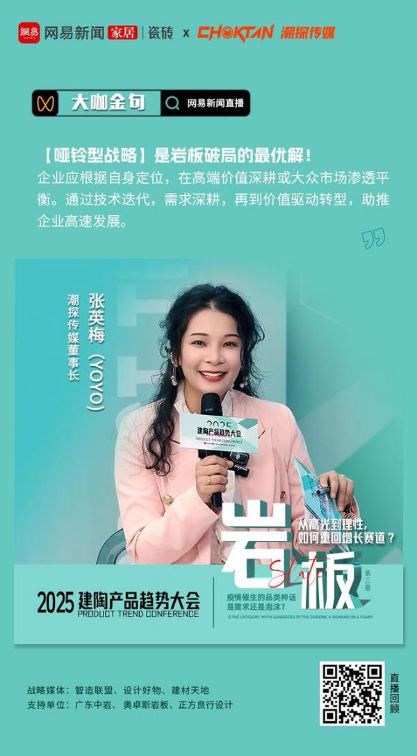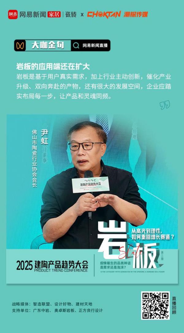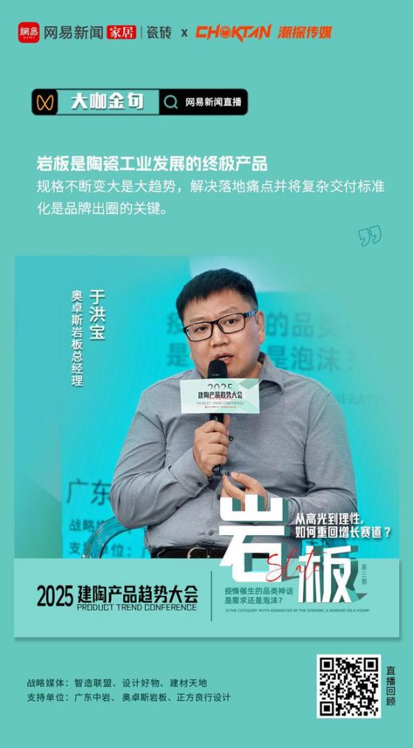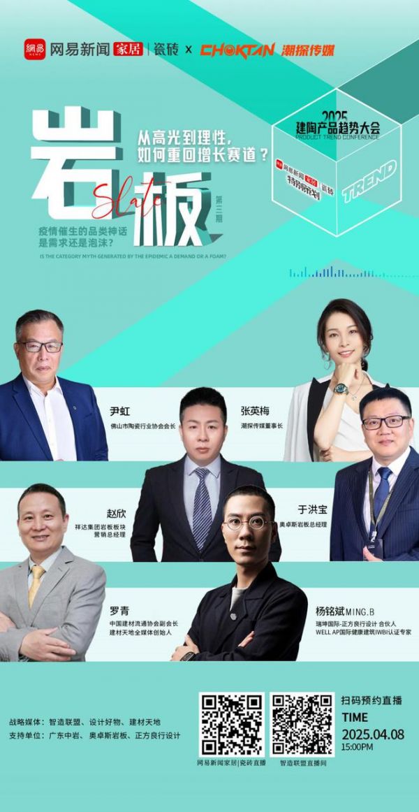在当下建陶行业不断变革的浪潮中,岩板这一品类的发展备受瞩目。4月8日,由网易新闻家居|瓷砖特别策划的《2025建陶产品趋势大会》第三期圆满举行。本期大会聚焦“岩板:从高光到理性,如何重回增长赛道?——疫情催生的品类神话,是需求还是泡沫?”这一核心议题,深入探讨岩板品类的价值重构与未来发展路径。在行业转型的关键节点,岩板凭借技术创新与应用拓展,正从“规模竞赛”向“价值深耕”转变。