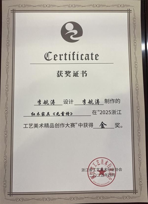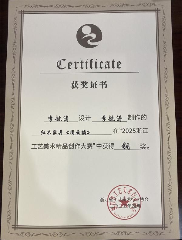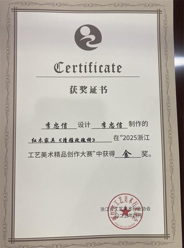 在“2025浙江工艺美术精品创作大赛”中,李忠信红木的清雅玫瑰椅和元首椅凭借其精湛的工艺和独特的设计,荣获金奖,闲云榻则荣获铜奖。这些荣誉不仅是对李忠信红木工艺水平的高度认可,更是对其在传承与创新方面不懈努力的肯定。金奖的获得,不仅是对李忠信红木品牌实力的展示,更是对中华传统工艺的传承与弘扬。