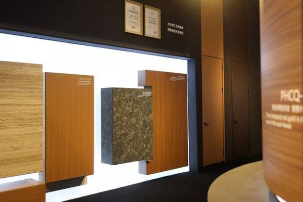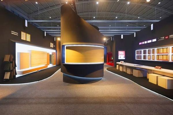 现场高达2.75米的环抱式立体展陈设计,全方位呈现板材细节,每一款板材均完美诠释颜值与健康并存的理念。