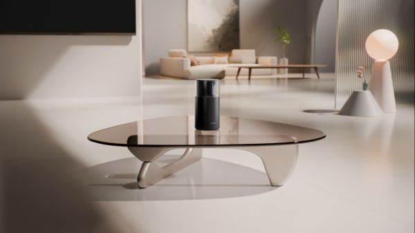 其“寰宇逐星”设计理念,将科技符号转化为诗意语言:圆柱形机身以星夜黑低饱和色系呈现,哑光表面流淌着细密纹理,宛如太空舱的隐秘纹路;顶部环形光带与冰蓝呼吸灯构成动态网络状态指示器,光晕流转间,恍若银河倾泻于客厅一隅。