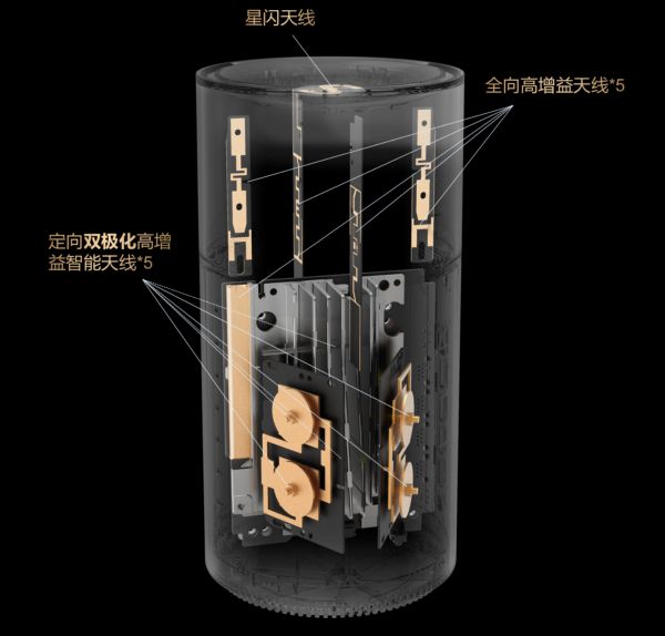 与传统“八爪鱼”造型形成鲜明对比的是其隐藏式全向天线设计。11根天线(5根全向高增益天线+5根定向智能天线+1根星闪天线)被巧妙封装于极简机身内,彻底避免了外置天线的视觉割裂感。让空间呼吸更自由。