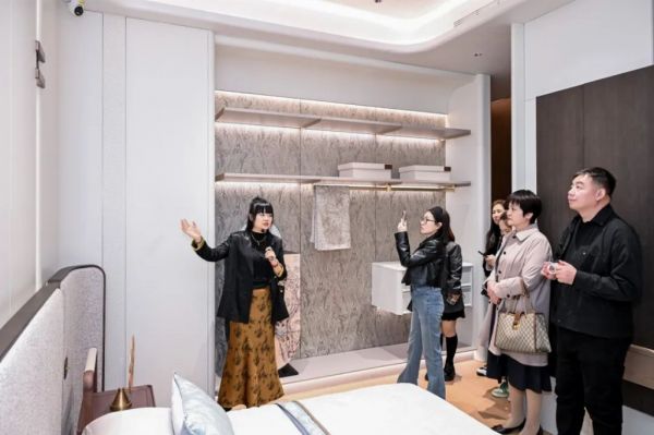 在消费升级的背景下,当代人对“家”的定义已超越物理空间,转而追求“精神栖息地”的构建。华鹤敏锐捕捉到这一趋势,将单一的家具产品转化为“场景化体验”。在全新展厅中,华鹤寻宋式美学脉络,将千年木艺基因融入当代人居想象。从进门的迎宾区以开放的圆弧造型呈现,寓意“鹤迎天下客”,暗合“有客自远方来,不亦乐乎”的宋人待客之道;悦影空间采用一字型开放式一体化布局,让亲情自然流淌于生活动线之中;思南·臻系列卧室的门墙柜一体化设计,跨材质同色工艺,构筑一方静谧的苏绣美学之境。