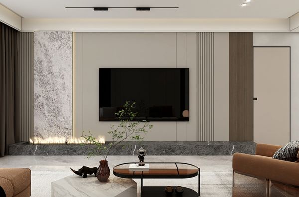 全屋吊顶加无主灯设计。客厅吊顶一圈双层石膏板做石膏线,拔高空间视觉高度。客厅选用无主灯摒弃了传统吊灯,使用磁吸轨道灯、筒灯、线性灯等辅助光源,使得客厅光线更加均匀,照明有层次感。