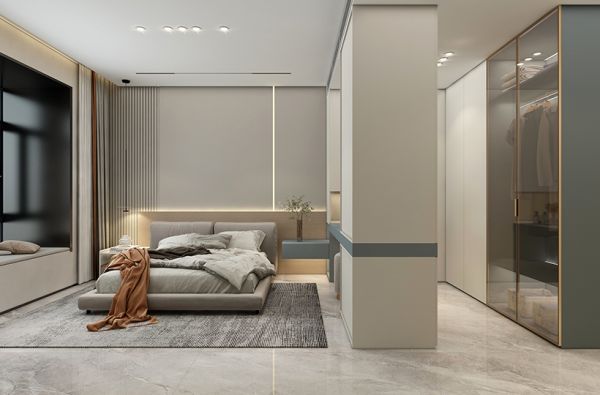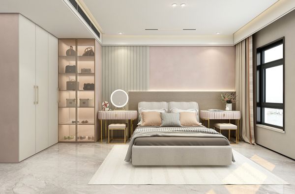 主卧嵌入式床头柜连衣柜设计,悬空梳妆台连高柜设计,半开放式衣帽间,方便拿取衣物,突显空间整体设计感与趣味性。柔和的浅色系基调作为空间的主色调,搭配无主灯设计烘托氛围,赋予空间典雅内敛的舒适氛围。房间各处细节充分得到了视觉的延伸。