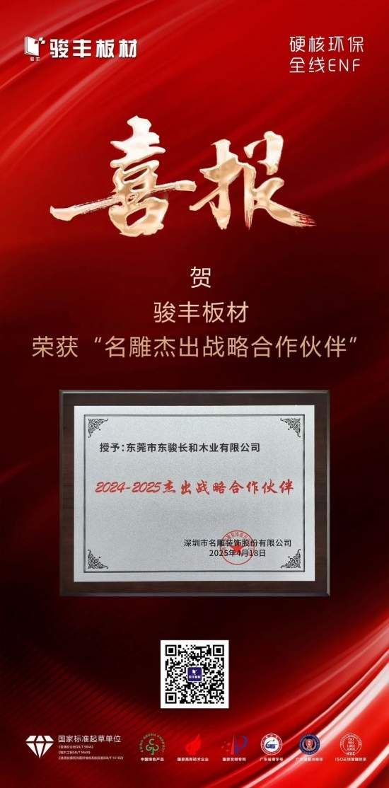 自2005年骏丰板材与名雕装饰达成战略合作以来,双方始终以环保、安全、品质为核心,共同研发了“马六甲环保板材”“名雕专用阻燃防蛀板”等明星产品,从高端住宅到商业地标,早已成为大湾区品质人居的闪亮名片!此次获奖,既是对双方20年协作成果的高度认可,亦是对骏丰板材“为美好做好每一块板”匠心实力的再次印证。