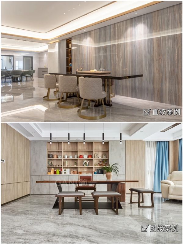 大理石瓷砖的纹理类型主要有流纹、直纹、团纹、细纹等,能够呈现不同的空间效果。直纹能起到延伸空间、拉大视觉的效果;流纹高贵典雅,沉稳大气;团纹多用在背景墙打造中;细纹的应用氛围比较广,让空间看起来精致大气。