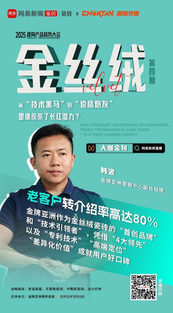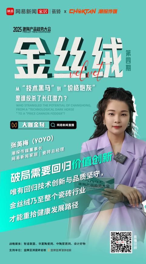 作为近年来建陶行业最具争议的创新品类之一,金丝绒以“柔光质感+超强抗污”的差异化优势打破同质化僵局,却在市场快速扩张中陷入低质仿制与价格内卷的泥潭。4月20日,由网易新闻家居|瓷砖特别策划的《2025建陶产品趋势大会》第四期圆满落幕。本期聚焦建陶领域“金丝绒”工艺的困境与破局,围绕其从“技术黑马”到“价格混战”的跌宕历程展开深度探讨。