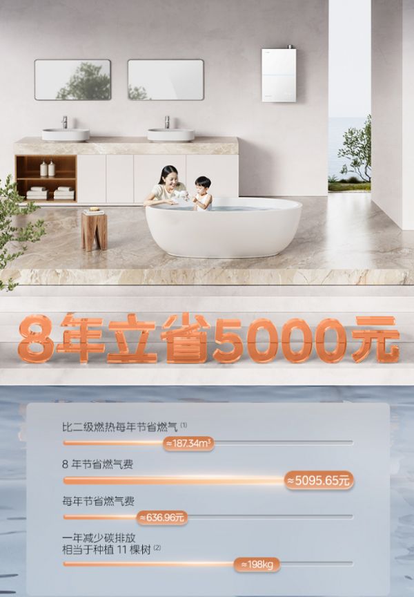 美的无冷感一级能效燃气热水器创新采用航天级技术与材料,其舱体运用 CFB 航天级恒温层密闭舱工艺,并采用火箭耐高温材料打造,保障了产品的性能与耐用性。节能零冷水技术通过AI智能识别家中循环水路长度,减少循环长度和耗气量,可减少燃气浪费。材料与技术上的突破让美的无冷感一级能效燃气热水器将热效率提升到行业领先的107.2%,达到国际领先水平,使用8年能为用户节省下 5000 元。