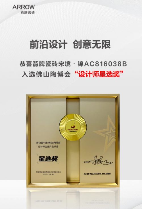 箭牌瓷砖2025年全新重磅超品「宋境·锦」凭借出色的原创产品力,受到众多设计师的深度认可,荣获第42届佛山陶博会“设计师星选奖”。